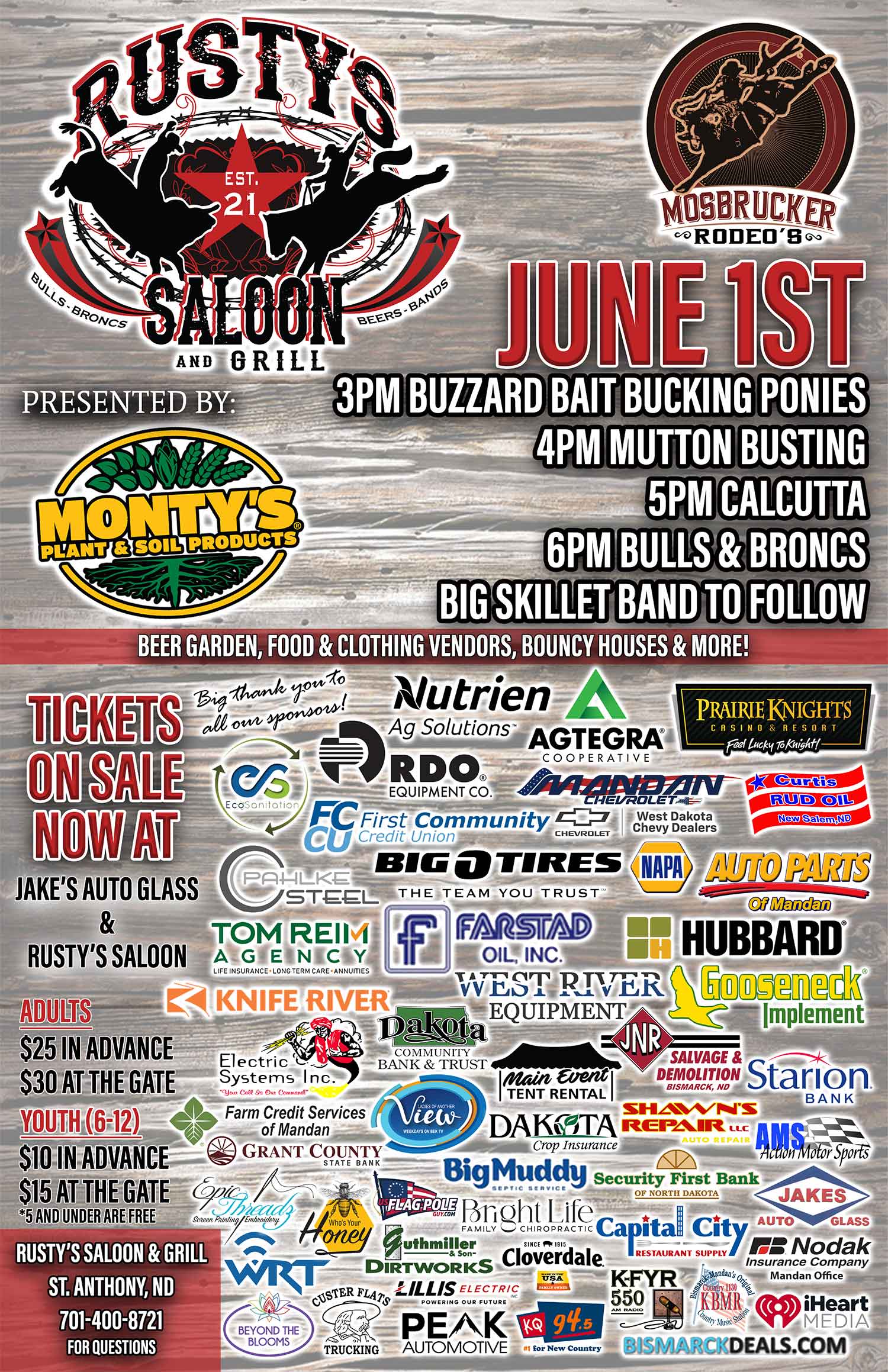 Rusty’s Saloon & Grill along with Big Bucks ProRodeo presents the 5th Annual Bulls & Broncs set for Saturday, June 7, 2025 at the St. Anthony Fairgrounds! Bring your friends & families to this all afternoon event, sure to please everyone who attends! New this year our Friday night PRE-PARTY on June 6 with Big Skillet Band starting at 8pm.
