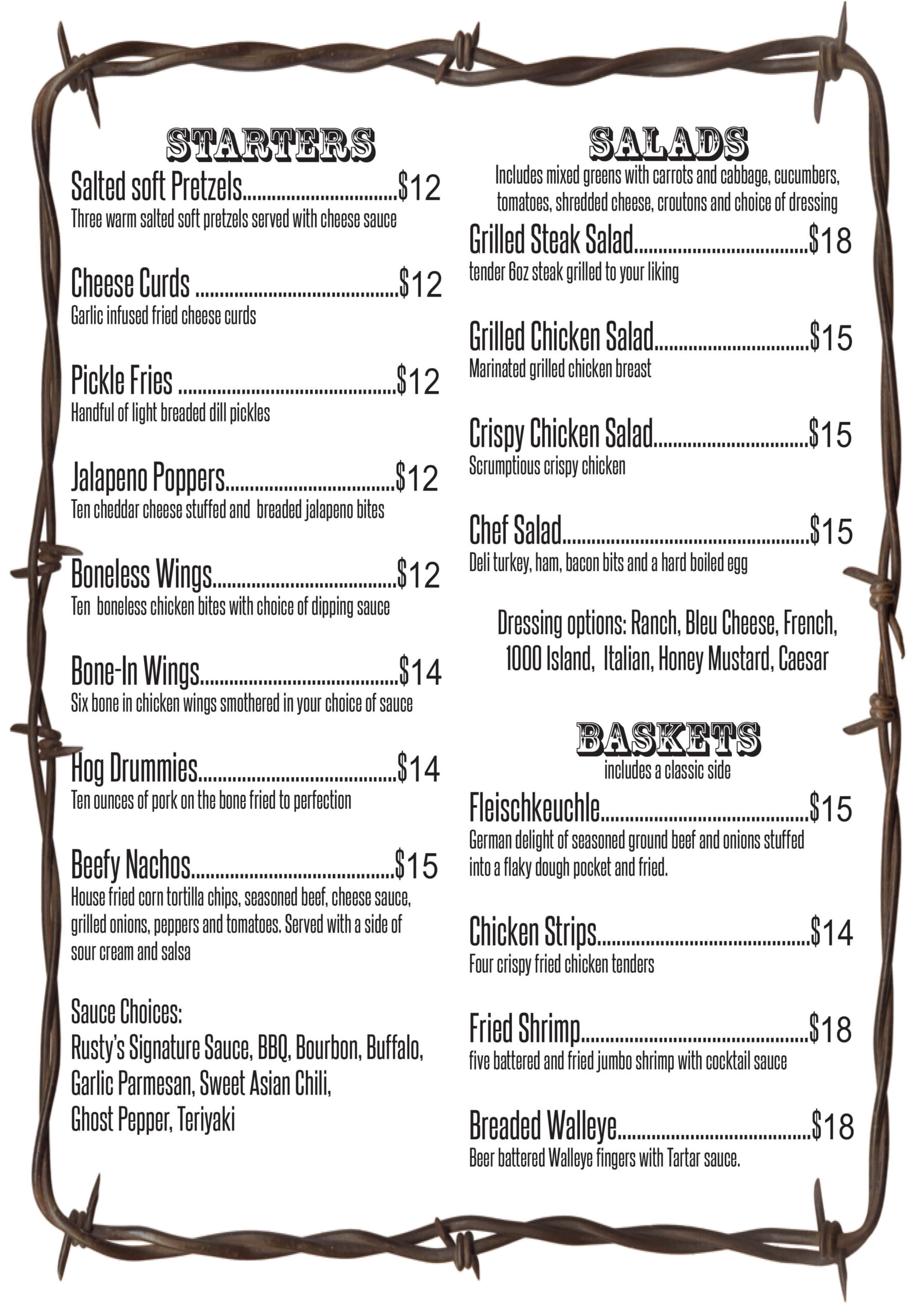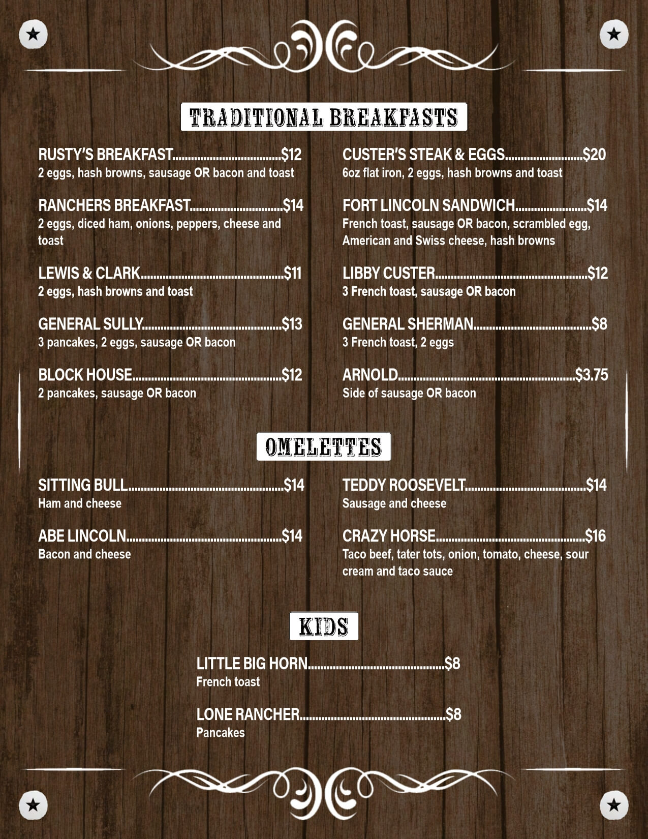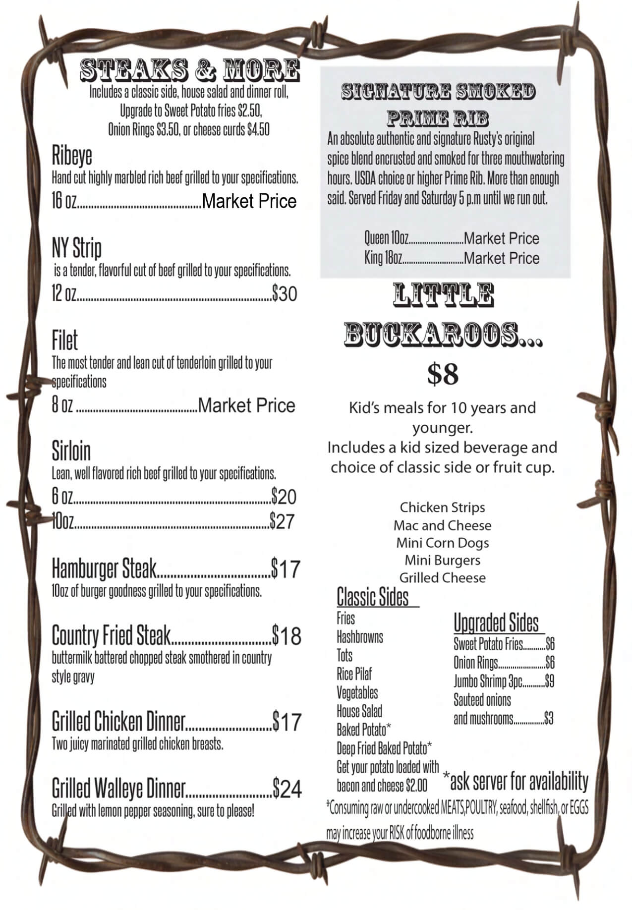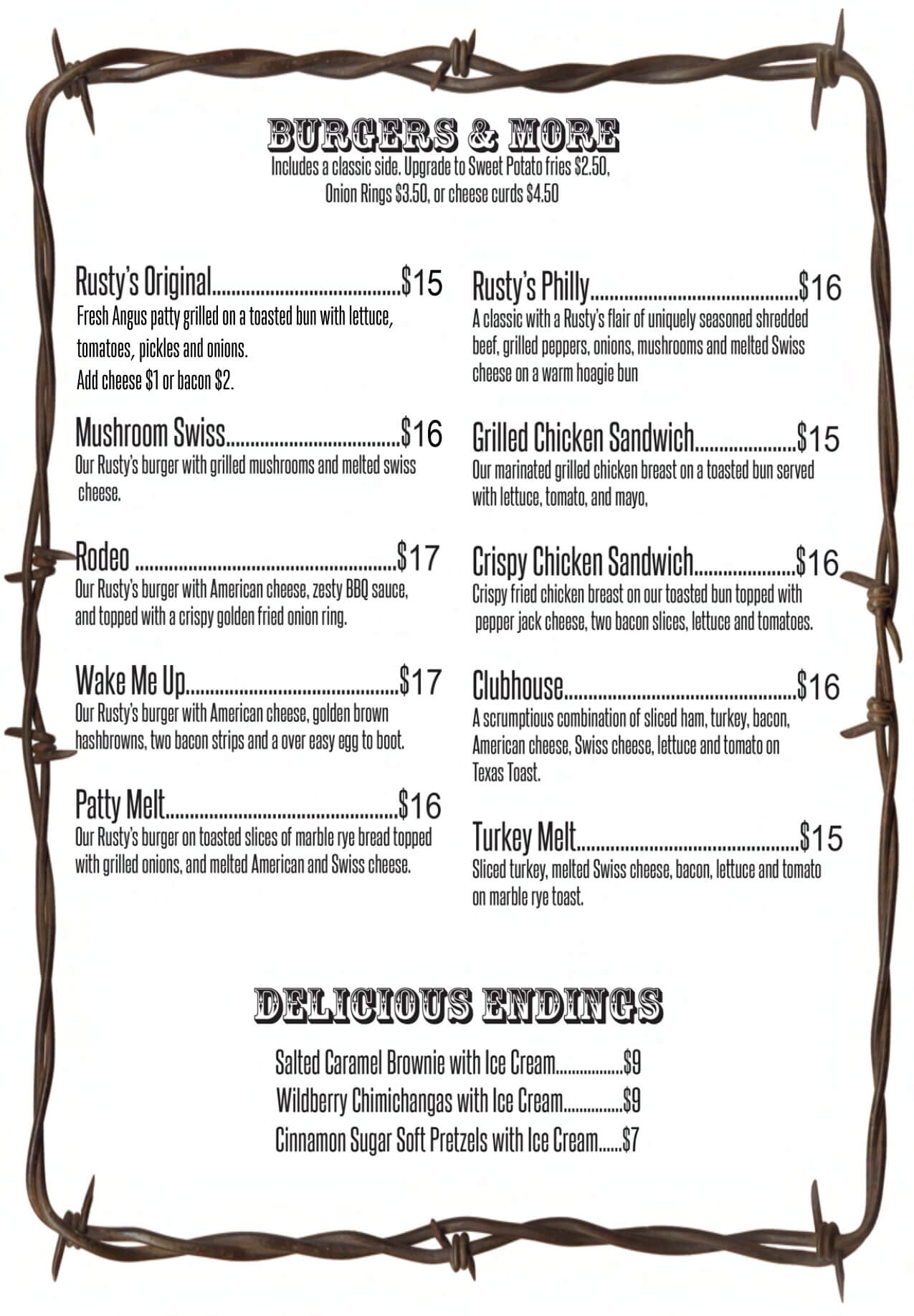Head on over to Rusty’s where our food’s as legendary as the cowboys who surround the area! Our kitchen’s cookin’ up the most succulent steaks and juiciest burgers this side of the Mississippi. Each plate’s piled high with hearty, homestyle fixins that’ll have you hollerin’ for more.